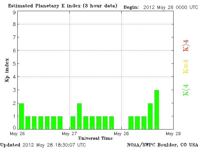 Geophysical Activity Forecast: The geomagnetic field is expected to be mostly quiet for the next 3 days (28-30 May)