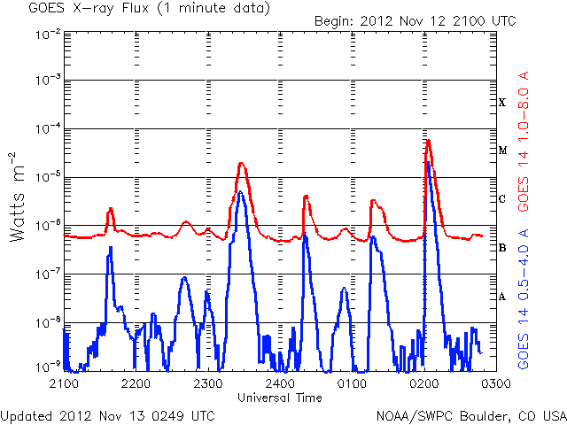 IIA. Geophysical Activity Summary 11/2100Z to 12/2100Z: The geomagnetic field has been at quiet levels for the past 24 hours. Solar wind speed, as measured by the ACE spacecraft, reached a peak speed of 362 km/s at 12/0605Z. Total IMF reached 12 nT at 12/0724Z. The maximum southward component of Bz reached -8.1 nT at 12/1934Z. IIB. Geophysical Activity Forecast: The geomagnetic field is expected to be at mostly active with a chance for minor storm levels early on day one (13 Nov) due to the arrival of the CMEs from 09/1524Z and 10/0539Z. Activity is expected to decrease to generally unsettled levels on day 2 (14 Nov) as CME effects subside. On day 3 (15 Nov) conditions are expected to return to mostly quiet levels.