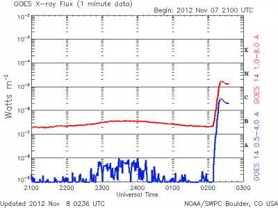 Анализ активных областей и активности с 21:00 7 ноября по 21:00 8 ноября: Солнечная активность последние 24 часа была на среднем уровне. Наибольшее солнечное событие было М1 наблюдавшееся в 02:23 8 ноября в области 1611 (N12E66). Событие М1 было связано с корональным выбросом масс (CME) на восточном лимбе (ожидается, что не геоэффективное) и тип II радио диапазона. На обратной стороне, полное гало выброса наблюдалось позже (первый вход С2 в поле зрения было в 11:12 8 ноября); Стерео образ показывает, что источником был старая область 1598. На диске наблюдается 6 областей пятен включая две новые пронумерованные группы: Область 1611 (N12E66) и 1612 (N06E71). Прогноз солнечной активности: Солнечная активность будет на низких уровнях с незначительной вероятностью умеренных уровней в ближайшие три дня (9-11 ноября).
