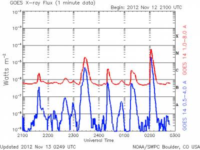Обзор геофизической активности с 21:00 12 ноября по 21:00 13 ноября: за последние 24 часа геомагнитное поле было на возмущенном уровне. Скорость солнечного ветра, как зафиксировано космической станцией ACE, достигала максимума в 504 км/сек в 01:11 13 ноября. Общий индекс магнитного поля (IMF) достиг 22,8 нТ в 00:53 13 ноября. Максимальный компонент Bz в южном направлении достиг -19,5 нТ в 23:38 13 ноября. АСЕ показала приход ударной волны в 22:16 12 ноября.Наблюдался внезапный импульс в 23:16 12 ноября (16 нТ согласно измерениям магнетометра Boulder USGS). Прогноз геофизической активности: геомагнитное поле станет возмущенным в начале первого дня (14 ноября) из-за спада влияния коронального выброса масс. В первый и второй день (14 и 15 ноября) поле будет от спокойного до слабовозмущенного из-за влияния высокоскоростного потока из корональной дыры отрицательной полярности. В третий день (16 ноября) условия снова станут спокойными. Есть небольшая вероятность достижения протонами порогового значения в ближайшие три дня (14 - 16 ноября).