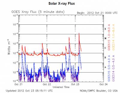 | Solar Activity Forecast: Solar activity is expected to be moderate to high with occasional M-class flares, and a slight chance for an isolated X-class flare for the next three days (23 - 25 Oct).
