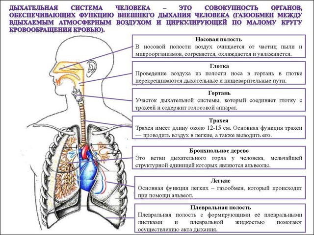 |  Дыхание – это совокупность процессов, обеспечивающих поступление в организм человека кислорода, использование его для окисления органических веществ и удаления из организма углекислого газа. Органы дыхания человека условно делят на воздухоносные пути и лёгкие. Главная роль первых – беспрепятственная доставка воздуха к лёгким. Нижние дыхательные пути – это трахея, соединённые с ней бронхи, а также лёгкие. Все вместе они образуют единую функциональную систему. При вдохе воздух «втягивается» внутрь. В этом процессе участвуют диафрагма, наружные межреберные и межхрящевые мышцы. Во время вдоха диафрагма уплощается, грудная клетка расширяется, что способствует движению воздуха в дыхательные пути и в лёгкие. В лёгких воздух попадает в замкнутые «пузырьки» - альвеолы. Они и составляют основную функциональную часть легких.