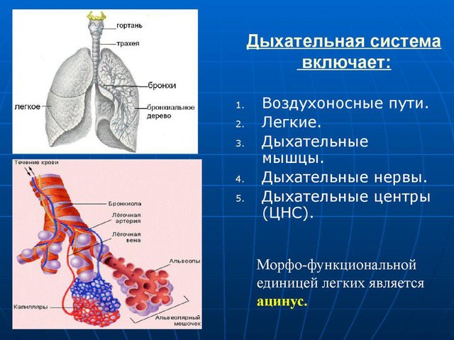 | В дыхательную систему входят дыхательные пути, легкие и мышцы, обеспечивающие процесс дыхания - диафрагма, межреберные мышцы, мышцы шеи и живота. В дыхательных путях воздух очищается и увлажняется, мышцы создают своеобразный насос, обеспечивающий приток воздуха в легкие, а в легких происходит газообмен. В легких находятся альвеолы - крошечные пузырьки с толщиной стенки всего в одну клетку. Такая малая толщина позволяет вести газообмен. Из-за разного парциального давления газов (можно сказать еще напряжения) в альвеолах и эритроцитах в кровь поступает кислород, а из крови в легкие выходит углекислый газ (и это тоже часть дыхания). Обмен крови в легочном капилляре происходит примерно за 0,75 секунды, но этого времени хватает на то, чтобы парциальные давления в альвеолах и в крови пришли в равновесие.